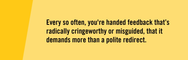Nobody really teaches us how to tell a client their idea is bad. It’s one of those things you’re just supposed to figure out, like pivot tables. And yet, it’s one of the most important skills in advertising, maybe the most important. Because every so often, you’re handed feedback that’s radically cringeworthy or misguided, that it demands more than a polite redirect. It requires a polite and respectful annihilation.